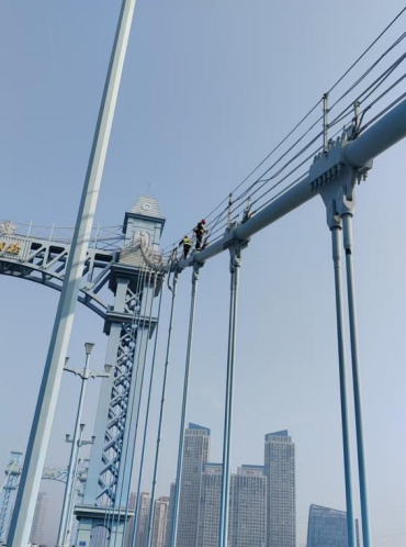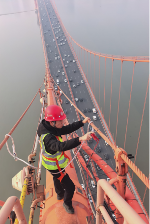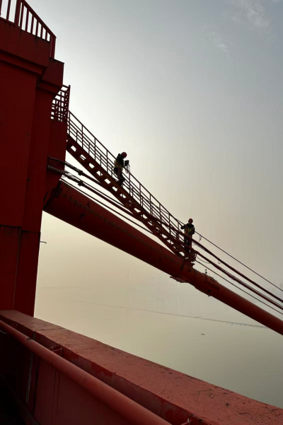 鸚鵡洲長江大橋作為世界首座主纜連續(xù)的三塔四跨懸索橋,檢測工作堪稱一場“高空芭蕾”。檢測人員需在距離江面數(shù)十層樓高的懸索上行走操作,腳下是奔騰江水,身旁是呼嘯寒風,懸索在大風與溫差影響下不斷晃動,極大考驗著檢測人員的平衡能力與心理素質(zhì)。為保障安全,檢測人員全程系掛雙鉤交替式安全帶,在保持自身穩(wěn)定的前提下,精準檢測懸索表面、錨固點及航空障礙燈的接地與過渡電阻,以專業(yè)與勇氣守護橋梁安全。